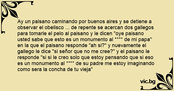 Ay un paisano caminando por buenos aires y se detiene a observar el obelisco ... de repente se acercan dos gallegos para tomarle el pelo al paisano y le dicen "oye paisano usted sabe que esto es un monumento al **** de mi papa" en la que el paisano responde "ah si?" y nuevamente el gallego le dice "si señor que no me cree?" y el paisano le responde "si si le creo solo que estoy pensando que si eso es un monumento al **** de su padre me estoy imaginando como sera la concha de tu vieja"