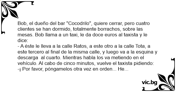 - A éste le lleva a la calle Ratos, a este otro a la calle Tota, a este tercero al final de la misma calle, y luego va a la esquina y descarga al cuarto. Mientras habla los va metiendo en el vehículo. Al cabo de cinco minutos, vuelve el taxista pidiendo: