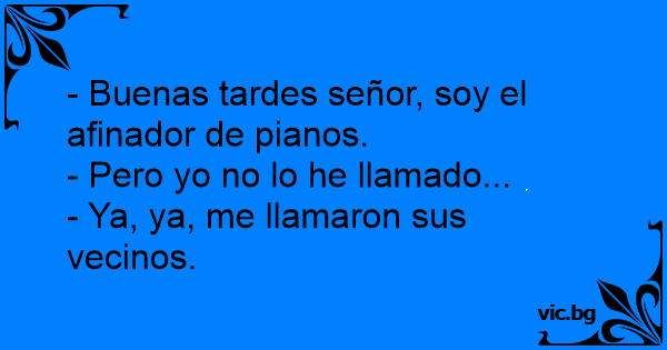 Al hombre le tocan el timbre: - Hola, vengo a afinar el piano. - Tengo piano pero yo no llamé a ningún afinador!!! - Pero los vecinos si, contestó el hombre en la puerta.