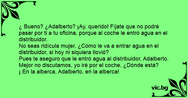 ¿ Bueno? ¿Adalberto? ¡Ay, querido! Fíjate que no podré pasar por ti a tu oficina, porque al coche le entró agua en el distribuidor.