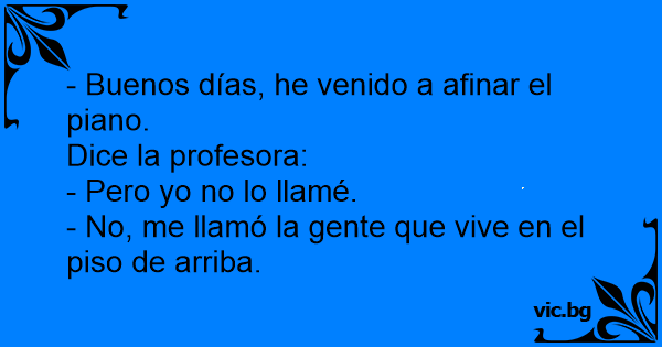 Το πιάνο - Buenas tardes señor, soy el afinador de pianos. - Добро утро, идвам да Ви настроя пианото. Al hombre le tocan el timbre: - Hola, vengo a afinar el piano. - Tengo piano pero yo no llamé a ningún afinador!!! - Pero los vecinos si, contestó el hombre en la puerta. L'accordeur de pianos se présente chez Madame Teuteufe - Mais j'ai jamais demandé d'accordeur ! - Vous non mais vos voisins oui ! En mand banker på døren til en lejlighed: "Jeg kommer for at stemme Deres klaver." "Jamen, jeg har da ikke bedt Dem om at komme!" "Nej, men det har Deres naboer!" Adolfina övar flitigt på sitt piano då det ringer på dörren. – Goddag, jag är pianostämmaren, säger mannen som ringde på. – Men jag har inte beställt någon pianostämning. – Nej, men det har... Er komt een pianostemmer bij meneer Jansen. Meneer Jansen: "Ik heb helemaal geen pianostemmer besteld!" De pianostemmer: "Nee, maar de buren wel."