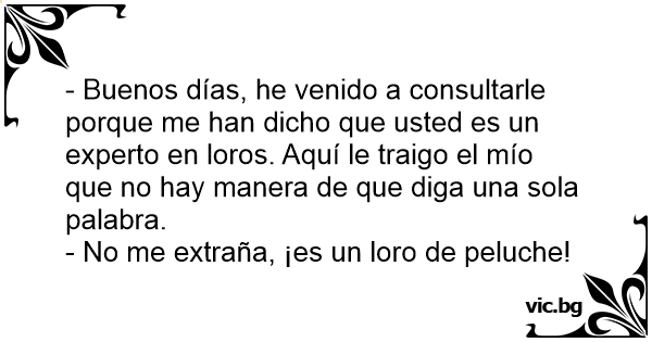 - Buenos días, he venido a consultarle porque me han dicho que usted es un experto en loros. Aquí le traigo el mío que no hay manera de que diga una sola palabra.