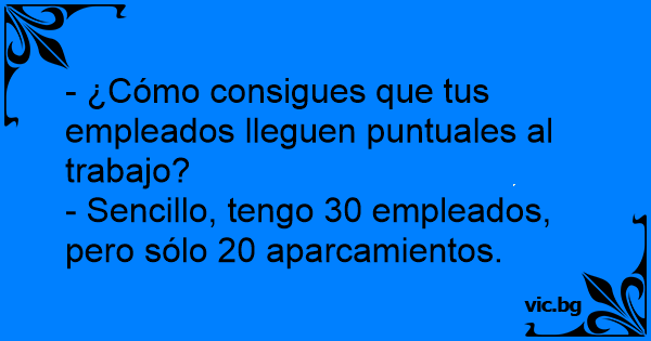 Egyik főnök a másiknak: - Hogy csinálod hogy az embereid mindig pontosak? - Egyszerű: 30 munkás és 20 parkolohely.