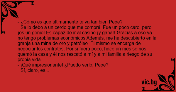 - Se lo debo a un cerdo que me compré. Fue un poco caro, pero ¡es un genio! Es capaz de ir al casino ¡y ganar! Gracias a eso ya no tengo problemas económicos Además, me ha descubierto en la granja una mina de oro y petróleo. Él mismo se encarga de negociar los contratos. Por si fuera poco, hace un mes se nos quemó la casa y él nos rescató a mí y a mi familia a riesgo de su propia vida.