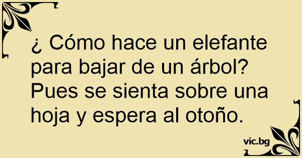 ¿ Cómo hace un elefante para bajar de un árbol?Pues se sienta sobre una hoja y espera al otoño. 11 0 0 Chistes de animales Chistes de campesinos