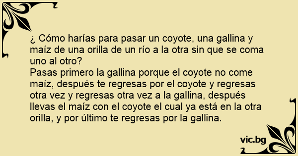 ¿ Cómo harías para pasar un coyote, una gallina y maíz de una orilla de un río a la otra sin que se coma uno al otro? Pasas primero la gallina porque el coyote no come maíz, después te regresas por el coyote y regresas otra vez y regresas otra vez a la gallina, después llevas el maíz соn el coyote el cual ya está en la otra orilla, y por último te regresas por la gallina.