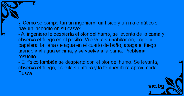 - Al ingeniero le despierta el olor del humo, se levanta de la cama y observa el fuego en el pasillo. Vuelve a su habitación, coge la papelera, la llena de agua en el cuarto de baño, apaga el fuego tirándole el agua encima, y se vuelve a la cama. Problema resuelto.