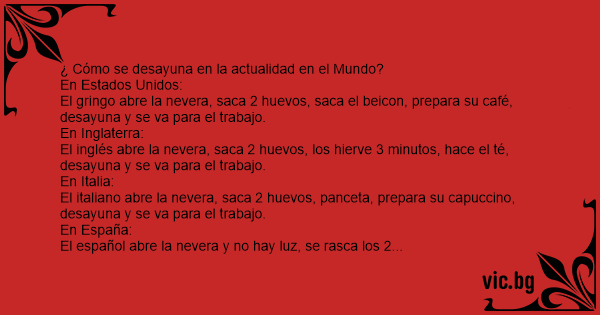 El italiano abre la nevera, saca 2 huеvоs, panceta, prepara su capuccino, desayuna y se va para el trabajo.