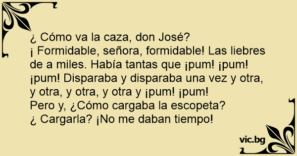 ¡ Formidable, señora, formidable! Las liebres de a miles. Había tantas que ¡pum! ¡pum! ¡pum! Disparaba y disparaba una vez y otra, y otra, y otra, y otra y ¡pum! ¡pum!