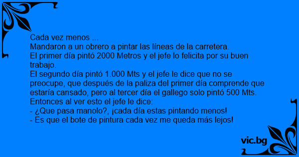 El segundo día pintó 1.000 Mts y el jefe le dice que no se preocupe, que después de la paliza del primer día comprende que estaría cansado, pero al tercer día el gallego solo pintó 500 Mts.