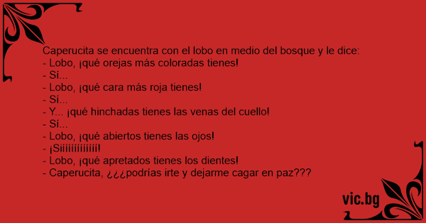 ¡Que orejas mas rojas tienes Lobo! Sí... ¡Lobo, que hinchadas tienes las venas del cuello! Sí... ¡ Lobo, que cara más colorada tienes! Sí... !Lobo, que apretados tienes los dientes! Coño Caperucita, ¿me quieres dejar cagar en paz?