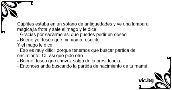 Capriles estaba en un sotano de antiguedades y ve una lampara magica,la frota y sale el mago y le dice: