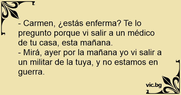 Una vecina le dice a otra: - ¿Consuelo, no estabas enferma? Consuelo dice: - ¿Por qué lo dices? - Pero Consuelo, si vi salir un médico de tu casa. - Eso no es nada, porque yo vi salir un general...