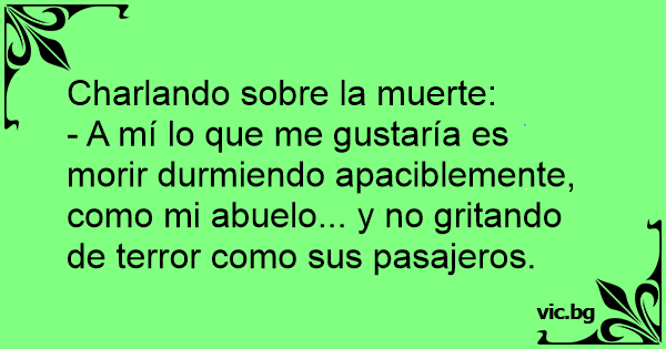 Исповед Was ist ein schöner Tot? - Искам да умра мирно и кротко в съня си - като дядо, Най-смешния виц в Шотландия според едногодишно изследване на учени от университета в Хардфордшир: Ich möchte so sterben wie mein opa - einfach einschlafen!!!!!!!!! (runterscrollen) Nicht weinend und schreiend!!!!!!!!!!!!!! Wie sein Beifahrer. When I die, I want to go peacefully like my Grandfather did, in his sleep - not screaming, like the passengers in his bus. Il maestro chiede alla classe: "Secondo voi qual è una morte tranquilla?" Wenn ich sterbe, will ich friedlich gehen. So wie mein Großvater im Schlaf ... und nicht laut kreischend wie die Mitfahrer in seinem Wagen. Ik wil graag dood gaan wanneer ik slaap, net als mijn opa. Niet schreeuwend en in paniek zoals de passagiers die hij vervoerde. I want to die peacefully in my sleep, like my grandfather. Not screaming and yelling like the passengers in his car. “Når jeg dør, vil jeg gerne dø som min bedstefar, der døde fredeligt i hans søvn. Ikke skrige som alle passagererne i hans bil. ” Chcę umrzeć spokojnie, we śnie - tak jak mój dziadek, a nie wrzeszcząc z przerażenia tak, jak jego pasażerowie. Moi je voudrais mourir comme mon grand-père, il est mort pendant son sommeil, il n'a rien senti. Ca c'est une belle mort ! Je ne voudrais pas surtout pas mourir en paniquant, en gesticulant et en... Eu quero morrer em paz, durante o sono, como o meu avô, e não gritando aterrorizado, como os seus passageiros... Haluaisin kuolla kuten lentokapteenina toiminut isäni, rauhallisesti nukkuessani. En paniikissa kirkuen, kuten hänen matkustajansa. Mannen på begravningen: - Jag skulle vilja dö som min far: stillsamt och i sömnen. Inte skrikande i panik som hans passagerare... To mand sidder på en bænk og er lidt småfilosofiske. Der tales om livet og døden. - Jeg vil sove stille ind, ligesom min Farfar, og ikke som min Farmor. Skrigende i flammerne, i passagersædet ved... Un professeur demande à ses élèves un exemple d'une belle mort. Une petite fille lève la main et dit: - Mon papi ! Il est mort en dormant... - Effectivement c'est une belle mort, pourrais-tu me... Jeg vil dø mens jeg sover, ligesom min bedstefar... - Ikke grædende og skrigende ligesom passagerne i den anden bil.