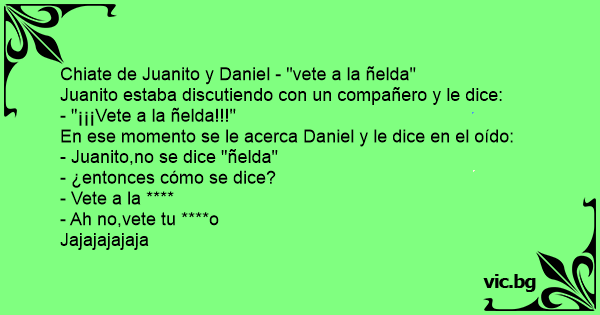 Chiate de Juanito y Daniel - "vete a la ñelda" Juanito estaba discutiendo соn un compañero y le dice: - "¡¡¡Vete a la ñelda!!!" En ese momento se le acerca Daniel y le dice en el oído: - Juanito,no se dice "ñelda" - ¿entonces cómo se dice? - Vete a la **** - Ah no,vete tu ****o