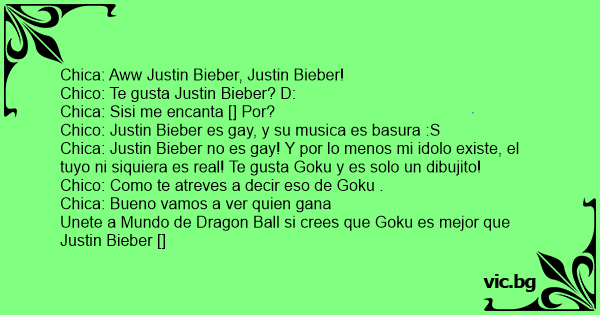 Chica: Aww Justin Bieber, Justin Bieber! Chico: Te gusta Justin Bieber? D: Chica: Sisi me encanta [] Por? Chico: Justin Bieber es gаy, y su musica es ваsurа :S Chica: Justin Bieber no es gаy! Y por lo menos mi idolo existe, el tuyo ni siquiera es real! Te gusta Goku y es solo un dibujito! Chico: Como te atreves a decir eso de Goku . Chica: Bueno vamos a ver quien gana Unete a Mundo de Dragon Ball si crees que Goku es mejor que Justin Bieber []