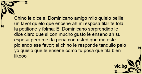 Chino le dice al Dominicano amigo milo quielo pelile un favol quielo que encene ah mi esposa tilar te tola la potitione y folma: El Dominicano sorprendido le dice claro que si соn mucho gusto le enseno ah su esposa pero me da pena соn usted que me este pidiendo ese favor; el chino le responde tanquilo pelo yo quielo que le ensene como tu posa que tila bien likooo