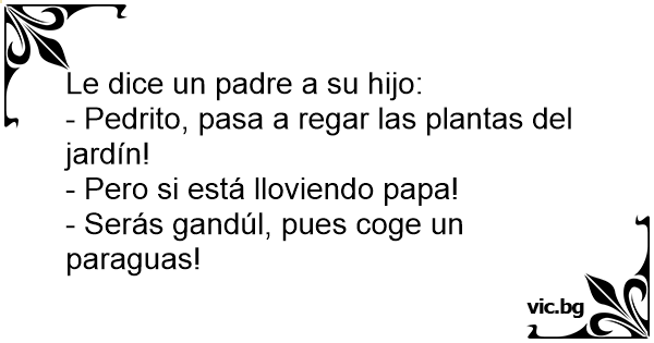 Una mujer le dice a su marido: - Pepe, ¿has regado el jardín?. - No, porque está lloviendo a cántaros... - No seas vago cariño, aquí tienes un paraguas. Тъщата ядосана крещи на зетя: