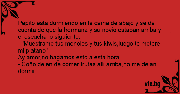 Pepito esta durmiendo en la cama de abajo y se da cuenta de que la hermana y su novio estaban arriba y el escucha lo siguiente: