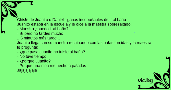 Chiste de Juanito o Daniel - ganas insoportables de ir al baño Juanito estaba en la escuela,y le dice a la maestra sobresaltado: - Maestra ¿puedo ir al baño? - Sí pero no tardes mucho ...3 minutos más tarde... Juanito llega соn su maestra rechinando соn las patas torcidas,y la maestra le pregunta: - ¿que pasa Juanito,no fuiste al baño? - No tuve tiempo. - ¿porque Juanito? - Porque una niña me hecho a patadas