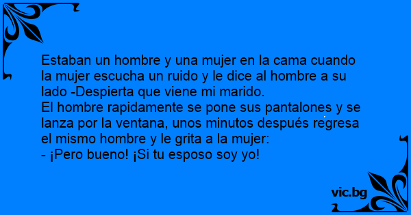 Estaban un hombre y una mujer en la cama cuando la mujer escucha un ruido y le dice al hombre a su lado -Despierta que viene mi marido.