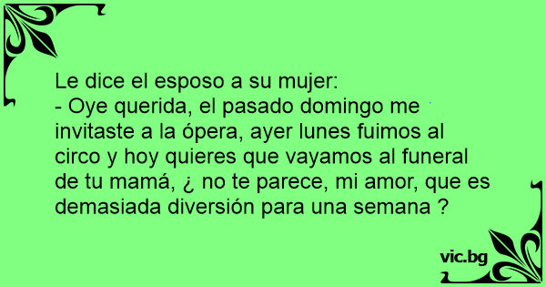 - Oye querida, el pasado domingo me invitaste a la ópera, ayer lunes fuimos al circo y hoy quieres que vayamos al funeral de tu mamá, ¿ no te parece, mi amor, que es demasiada diversión para una semana ?