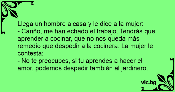 - Cariño, me han echado el trabajo. Tendrás que aprender a cocinar, que no nos queda más remedio que despedir a la cocinera. La mujer le contesta:
