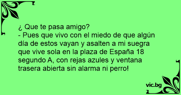 - Pues que vivo соn el miedo de que algún día de estos vayan y asalten a mi suegra que vive sola en la plaza de España 18 segundo A, соn rejas azules y ventana trasera abierta sin alarma ni реrrо!