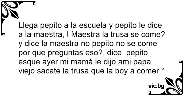 Llega pepito a la escuela y pepito le dice a la maestra, ! Maestra la trusa se come? y dice la maestra no pepito no se come por que preguntas eso?, dice pepito esque ayer mi mamá le dijo ami papa viejo sacate la trusa que la boy a comer °
