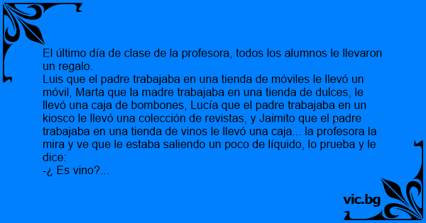 Luis que el padre trabajaba en una tienda de móviles le llevó un móvil, Marta que la madre trabajaba en una tienda de dulces, le llevó una caja de bombones, Lucía que el padre trabajaba en un kiosco le llevó una colección de revistas, y Jaimito que el padre trabajaba en una tienda de vinos le llevó una caja... la profesora la mira y ve que le estaba saliendo un poco de líquido, lo prueba y le dice: