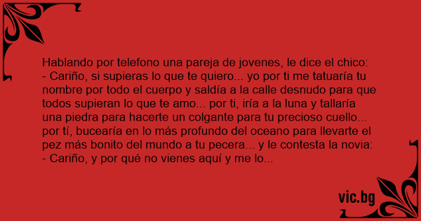 - Cariño, si supieras lo que te quiero... yo por ti me tatuaría tu nombre por todo el cuerpo y saldía a la calle desnudo para que todos supieran lo que te amo... por ti, iría a la luna y tallaría una piedra para hacerte un colgante para tu precioso cuello... por tí, bucearía en lo más profundo del oceano para llevarte el pez más bonito del mundo a tu pecera... y le contesta la novia: