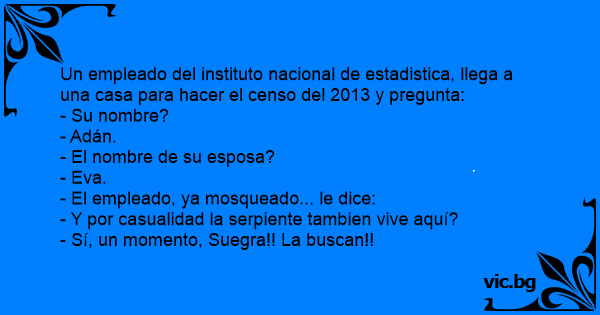 Un empleado del instituto nacional de estadistica, llega a una casa para hacer el censo del 2013 y pregunta: - Su nombre? - Adán. - El nombre de su esposa? - Eva. - El empleado, ya mosqueado... le dice: - Y por casualidad la serpiente tambien vive aquí? - Sí, un momento, Suegra!! La buscan!!