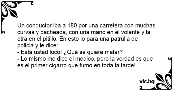Un conductor iba a 180 por una carretera соn muchas curvas y bacheada, соn una mano en el volante y la otra en el pitillo. En esto lo para una patrulla de policia y le dice: