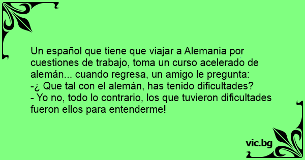 Un español que tiene que viajar a Alemania por cuestiones de trabajo, toma un curso acelerado de alemán... cuando regresa, un amigo le pregunta: