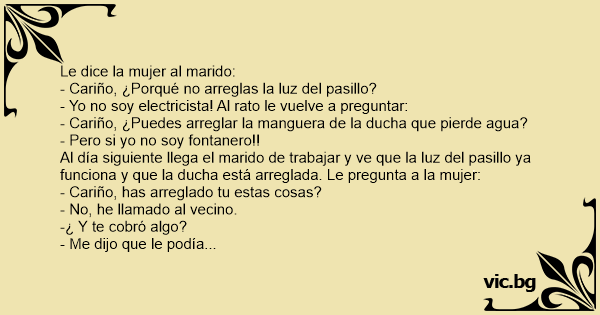 Al día siguiente llega el marido de trabajar y ve que la luz del pasillo ya funciona y que la ducha está arreglada. Le pregunta a la mujer: