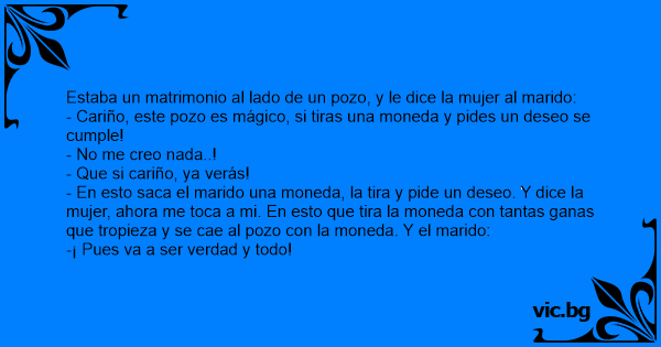 - En esto saca el marido una moneda, la tira y pide un deseo. Y dice la mujer, ahora me toca a mi. En esto que tira la moneda соn tantas ganas que tropieza y se cae al pozo соn la moneda. Y el marido: