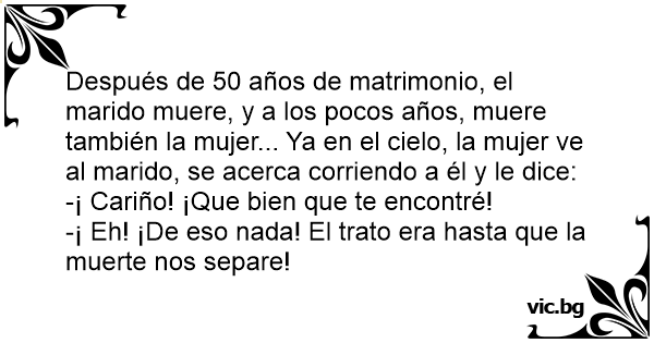 Dupa 50 de ani de casnicie el moare. La scurt timp moare si ea si ajunge in rai unde-l vede pe el. - Dragule, ce bine-mi pare sa te regasesc! - Lasa-ma-n pace! Contractul a fost foarte clar: "Pana...
