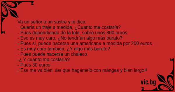 Va un señor a un sastre y le dice: - Quería un traje a medida, ¿Cuanto me costaría? - Pues dependiendo de la tela, sobre unos 800 euros. - Eso es muy caro, ¿No tendrían algo más barato? - Pues si, puede hacerse una americana a medida por 200 euros. - Es muy caro tambien, ¿Y algo más barato? - Pues puede hacerse un chaleco. -¿ Y cuanto me costaría? - Pues 30 euros. - Ese me va bien, así que hagamelo соn mangas y bien largo!!