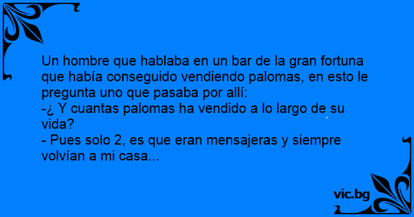Un hombre que hablaba en un bar de la gran fortuna que había conseguido vendiendo palomas, en esto le pregunta uno que pasaba por allí: