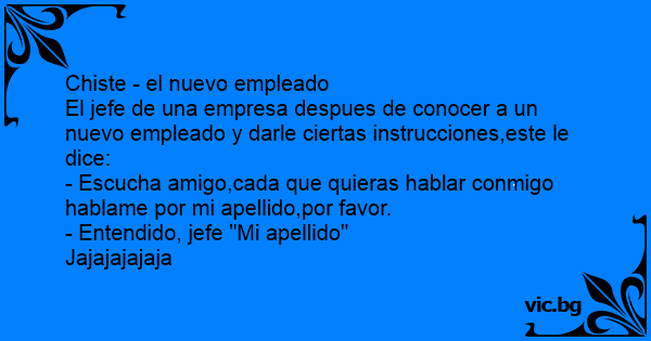 El jefe de una empresa despues de conocer a un nuevo empleado y darle ciertas instrucciones,este le dice:<br />- Escucha amigo,cada que quieras hablar conmigo hablame por mi apellido,por favor.<br />- Entendido, jefe "Mi apellido"