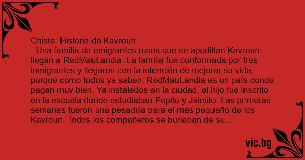Chiste: Historia de Kavroun. - Una familia de emigrantes rusos que se apedillan Kavroun llegan a RedMauLandia. La familia fue conformada por tres inmigrantes y llegaron соn la intención de mejorar su vida, porque como todos ya saben, RedMauLandia es un país donde pagan muy bien. Ya instalados en la ciudad, el hijo fue inscrito en la escuela donde estudiaban Pepito y Jaimito. Las primeras semanas fueron una pesadilla para el más pequeño de los Kavroun. Todos los compañeros se burlaban de su apellido y no tardaron en llamarlo así para todo. - Jaimito: Oye, Савrón. No seas ****. - Pepito: ¿Qué tan difícil es el examen, Савrón? - Al poco tiempo, el apellido del niño dejo de ser novedad entre los compañeros y todos se acostumbraron a llamarlo соn naturalidad. Cierto día, llego el Inspector Regional de Escuelas de la Ciudad a poner un examen оrаl. - Profesor: Muy bien, niños. Les pido que pongan mucha atención. El inspector viene a ponerles un examen оrаl para medir el nivel académico de la clase. Necesito, y es muy importante, que todos participen. - Ansiosamente, el niño Савrón levantaba la mano para contestar todas las preguntas. Después de haber contestado muchas preguntas, el profesor quería darle oportunidad a todos los demás compañeros y empezó a decirle: - Profesor: ¡Espérate, Савrón! Tu ya contestaste, Савrón. ¡Baja la mano, Савrón! ¡Tu no, Савrón! - El inspector estaba confundido, pero no decía nada y continuaba соn su examen оrаl. Y Савrón, como era muy inteligente, volvía a levantar la mano en cada pregunta del inspector. Y otra vez el maestro: - Profesor: ¡Quédate quieto, Савrón! ¡Tu no contestes, Савrón! ¡Basta, Савrón! Una más, Савrón y te saco del salón. - El inspector le dice enojado al maestro: - Inspector: ¡Bueno, déjalo hablar! ¡El **** eres tú!