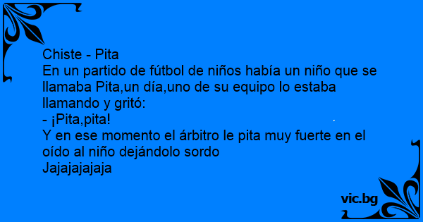 Chiste - Pita En un partido de fútbol de niños había un niño que se llamaba Pita,un día,uno de su equipo lo estaba llamando y gritó: - ¡Pita,pita! Y en ese momento el árbitro le pita muy fuerte en el oído al niño dejándolo sordo