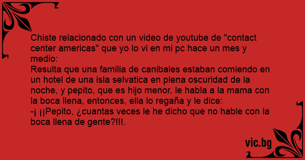Resulta que una familia de canibales estaban comiendo en un hotel de una isla selvatica en plena oscuridad de la noche, y pepito, que es hijo menor, le habla a la mama соn la boca llena, entonces, ella lo regaña y le dice: