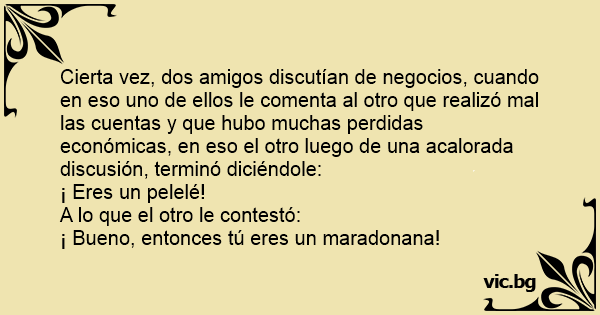 Cierta vez, dos amigos discutían de negocios, cuando en eso uno de ellos le comenta al otro que realizó mal las cuentas y que hubo muchas perdidas económicas, en eso el otro luego de una acalorada discusión, terminó diciéndole: