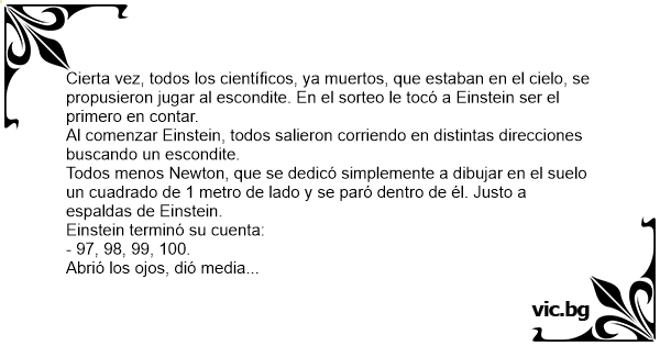 Toti oamenii de stiinta jucau fata'ascunselea in Rai. Se pune Einstein si incepe sa numere. Toti se ascund pe Unde gasesc, numai Newton ia o creta, traseaza un Patrat cu latura de 1 m si se aseaza...