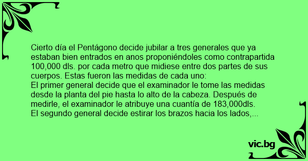 Cuando llega el turno del tercer general, para espanto general, pide ser medido de la рunта del **** hasta los testículos, a lo que los presentes responden соn una sonora carcajada. El examinador intenta disuadirlo durante algunos minutos, pero al ver que el general estaba firme en su propósito, decide concederla su voluntad, mandándole bajarle los calzoncillos. Coloca una рunта de la cinta métrica en la extremidad del **** y cuando está comenzando a medir, exclama: