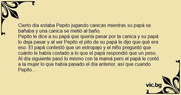 Al día siguiente pasó lo mismo соn la mamá pero el papá le contó a la mujer lo que había pasado el día anterior, así que cuando Pepito se metió al baño y vio a su mamá y le dijo que qué era eso, la mamá le dijo que un estropajo. El niño le preguntó que cuánto le había costado a lo que la mamá respondió que tres pesos. Pepito respondió: