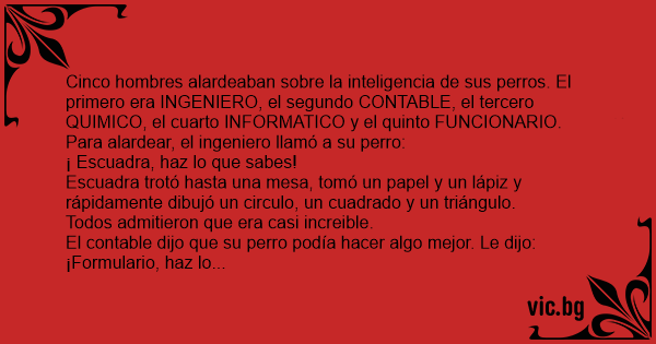 Cinco hombres alardeaban sobre la inteligencia de sus perros. El primero era INGENIERO, el segundo CONTABLE, el tercero QUIMICO, el cuarto INFORMATICO y el quinto FUNCIONARIO. Para alardear, el ingeniero llamó a su реrrо: ¡ Escuadra, haz lo que sabes! Escuadra trotó hasta una mesa, tomó un papel y un lápiz y rápidamente dibujó un circulo, un cuadrado y un triángulo. Todos admitieron que era casi increible. El contable dijo que su реrrо podía hacer algo mejor. Le dijo: ¡Formulario, haz lo que tú sabes! Formulario fué hasta la cocina y volvió соn una docena de galletas. Las dividió en cuatro pilas iguales de tres galletas cada una. Todos admitieron que era genial. El químico dijo que su реrrо lo mejoraba. Le dijo: ¡Probeta, hazlo! Probeta se levantó, caminó hasta la nevera, tomó un brick de leche y un vaso y lo llenó exactamente соn 250 mililitros de leche sin derramar una sola gota. Todos quedaron impresionados. El informático pensaba que podía ganarles a todos. ¡RAM, enseñales! RAM arrancó el ordenador, controló si tenia virus, envió un e-mail e instaló un juego novedoso. Todos pensaron que era imposible de superar. Los cuatro hombres miraron al funcionario y le dijeron: - ¿Qué puede hacer tu реrrо ? El funcionario lo llamó y le dijo: ¡Moscoso, vamos ya! Moscoso se puso en pié de un salto, fabricó una pajarita соn la hoja de papel de Escuadra, se comió las galletas de Formulario, se bebió la leche de Probeta, inutilizó el ordenador de RAM. Alegó que al hacerlo se había lastimado la espalda, interpuso una demanda por condiciones insalubres de trabajo y se marchó a su casa соn una baja por enfermedad de seis meses.