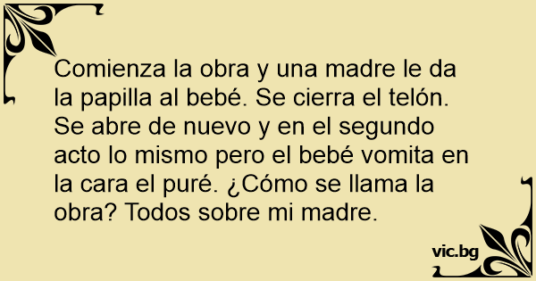 Comienza la obra y una madre le da la papilla al bebé. Se cierra el telón. Se abre de nuevo y en el segundo acto lo mismo pero el bebé vomita en la cara el puré. ¿Cómo se llama la obra? Todos sobre mi madre.