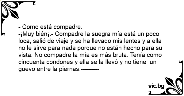 -¡Muy bién¡.- Compadre la suegra mía está un poco loca, salió de viaje y se ha llevado mis lentes y a ella no le sirve para nada porque no están hecho para su vista. No compadre la mía es más bruta. Tenía como cincuenta condones y ella se la llevó y no tiene un guevo entre la piernas.---------